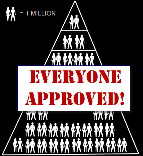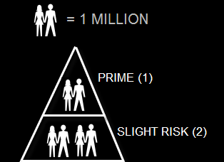 So let’s assume each couple icon in my pyramid represents demand for 1 million houses in a given year. That means that each year, banks provide loans that fuel demand for roughly 3 million homes. One million from the “prime” category and two million more from the “slight risk” category.
