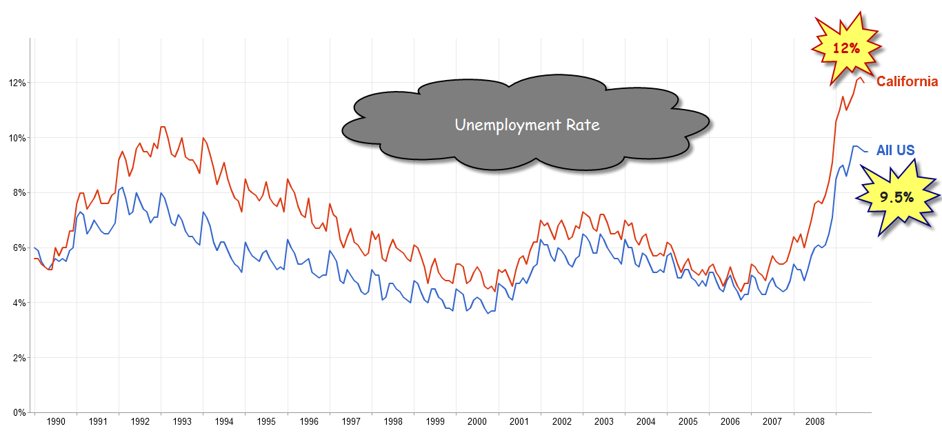 The unemployment rate has been steadily climbing, now at 9.5% throughout the United States and 12% for California. The real unemployment rate is closer to 18% when you account for people who have stopped looking for jobs and people who took part time or lower paying jobs, the underemployed. That’s 1 in 5 people either unemployed or making less money. That’s significant…and it’s only going to get worse. Unemployed people have a hard time paying mortgages, so we can expect foreclosures to increase with unemployment.