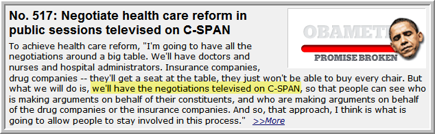 Click here and you can watch eight video clips of Obama promising there would be no “behind closed doors” deals, that transparency would be the rule and that the health care debates would be done in front of the American people by broadcasting them over C-SPAN.
