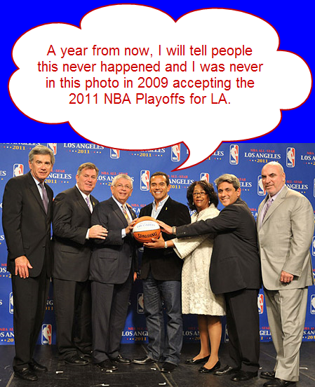 Fortunately for us, politicians tend to not be the brightest bulbs in the box, which is why they become politicians. The Mayor couldn’t come up with a credible lie fast enough, so unfortunately for him, he forgot that there was already an announcement last year by the NBA Commissioner awarding LA the 2011 All-Star Game.
