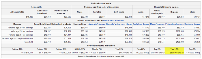 The first image is the breakout of household and individual incomes. You should note (yellow highlight) that less than 1.5 % of the population make the $250,000 and up that Obama said would pay for all this spending we are doing. It is impossible for 1.5% of the population to help support the other 98.5% and all this government spending. Brace yourself for additional taxes, regardless of how much you make.