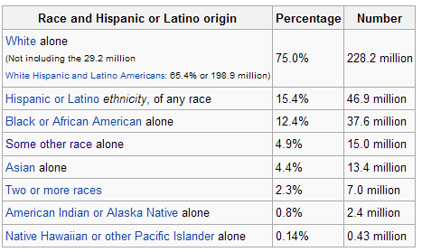 The following images are from Wikipedia. I thought it would be interesting for some readers to see what the demographics of the United States look like and to point out a couple key facts.