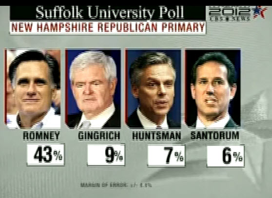 The latest CBS Poll ignores Ron Paul in the #2 position in New Hampshire showing only the first, third, fourth and fifth positions. CBS even went so far as to say Santorum was giving Romney “a run” even though Santorum is way down at 6% and Ron Paul was way up at 14% (Ron has moved even higher since then – as of yesterday Mitt has slipped to 35% and Ron has moved up to 20% – Click here for Suffolk University Poll).
