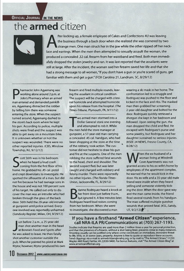 In light of this media blackout on the millions of times guns are used to protect children, women, the elderly and everyone else, I am publishing the samples each month from various NRA magazines. Each sample has a brief recount of the incident and cites the local paper you can find the story in if you want to know more.